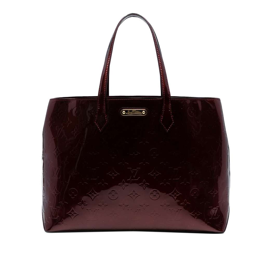 The Wilshire MM features a monogram vernis leather body, flat leather handles, an open top with a lobster clasp closure, and an interior zip pocket.