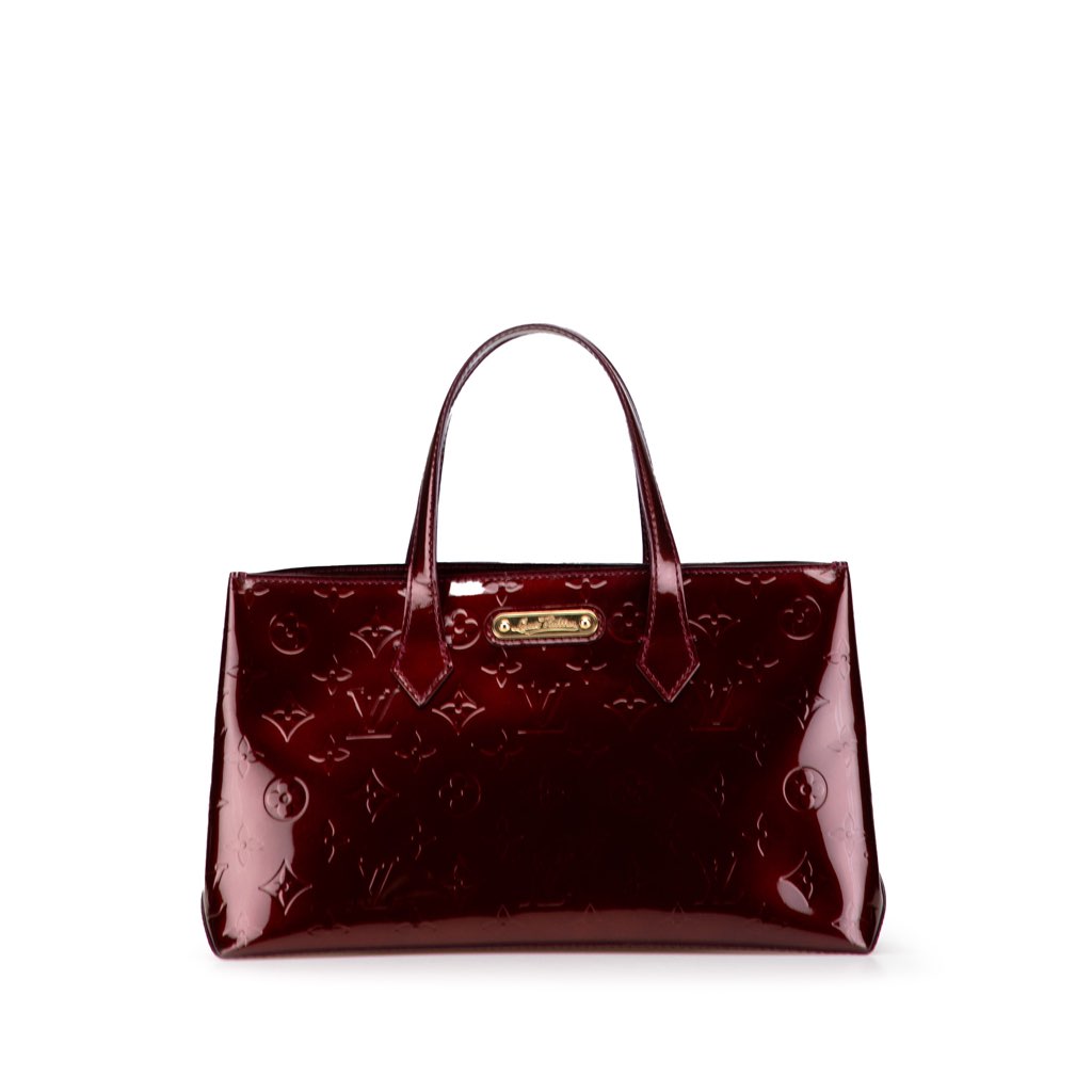 The Wilshire PM features a vernis leather body, flat leather handles, an open top with lobster claw closure, and an interior zip pocket.