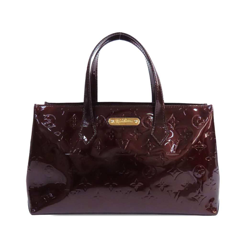 The Wilshire PM features a monogram vernis leather body, flat leather handles, an open top with a lobster clasp closure, and an interior zip pocket.