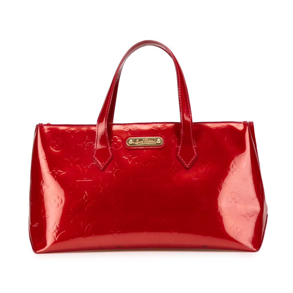 The Wilshire PM features a monogram vernis leather body, flat leather handles, an open top with a lobster clasp closure, and an interior zip pocket.