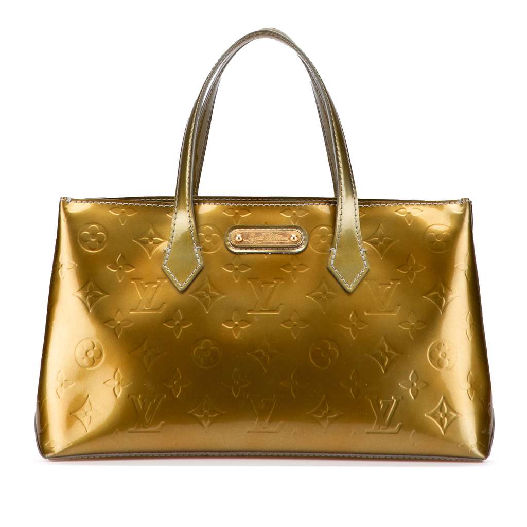 The Wilshire PM features a vernis leather body, flat handles, a top lobster claw closure, and an interior zip pocket.
