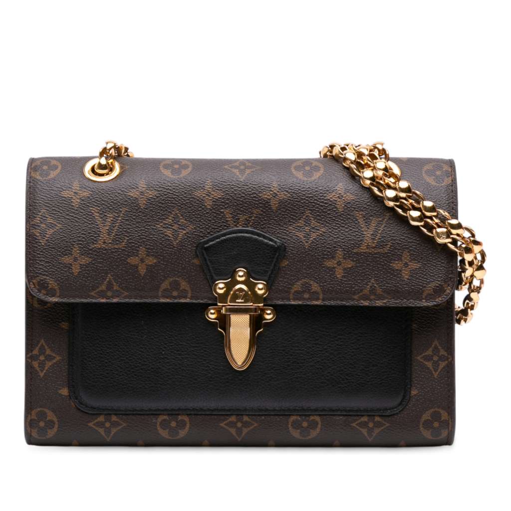 The Victoire features a monogram canvas body, a chain link shoulder strap, a front flap with gold-tone closure, and an interior zip pocket.