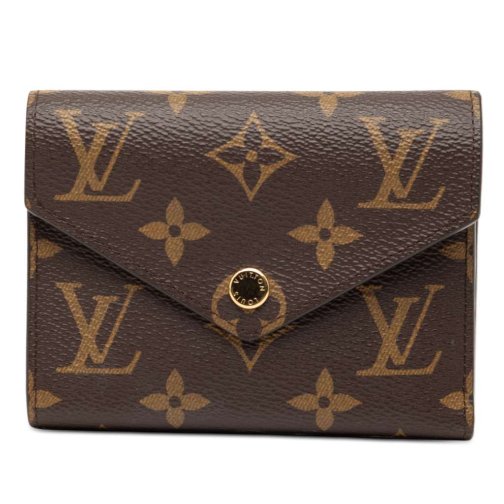 The Victorine wallet features a monogram canvas body, a flap with a snap button closure, and interior zip and slip pockets.