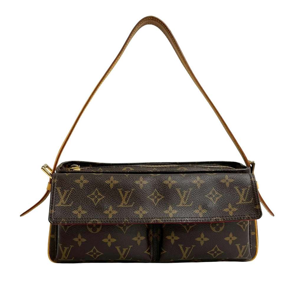 The Viva Cite MM features a monogram canvas body, an adjustable leather shoulder strap, exterior flap pockets, a top zip closure, and an interior slip pocket.