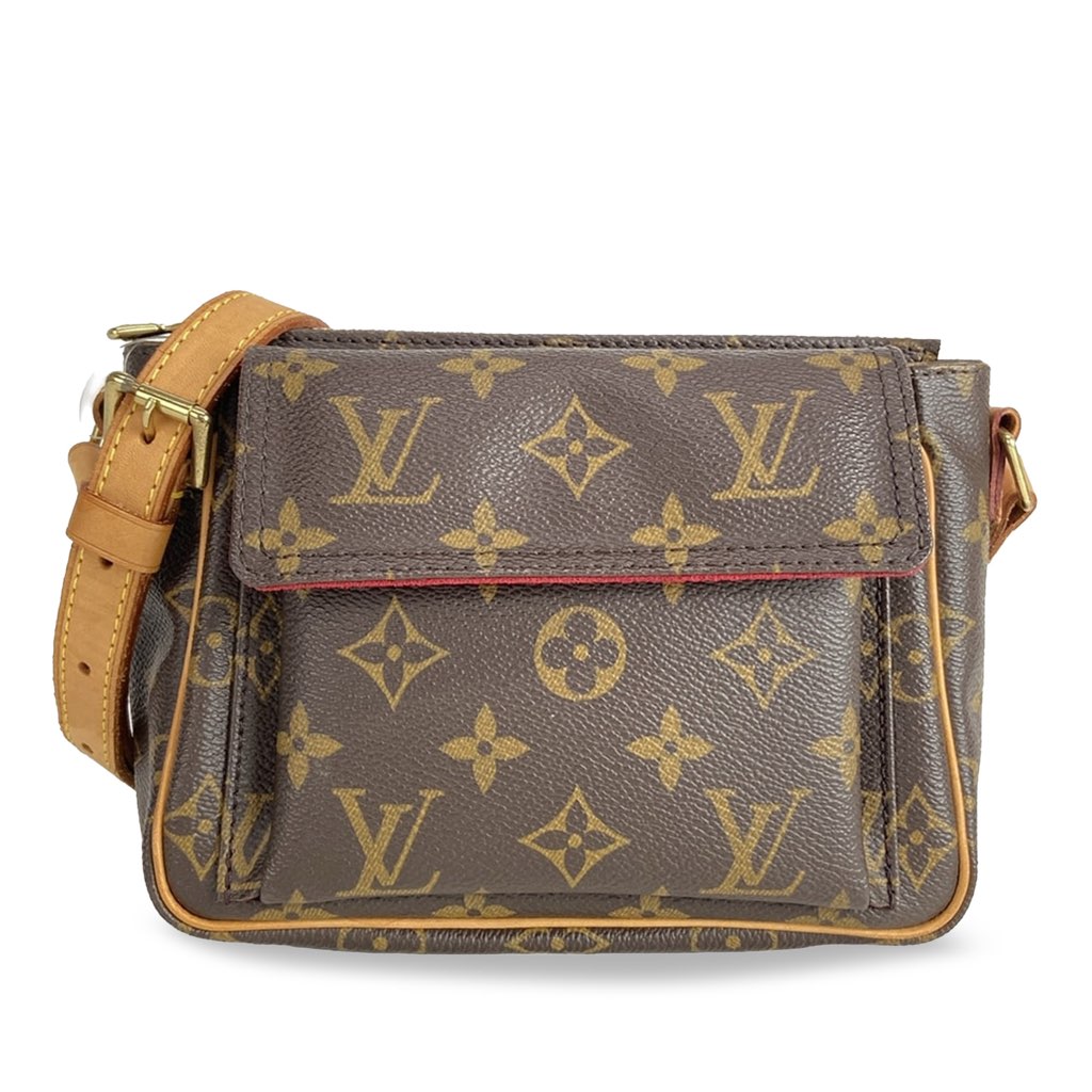 The Viva Cite PM features a monogram canvas body with vachetta leather trim, an adjustable flat vachetta leather shoulder strap, an exterior flap pocket, and