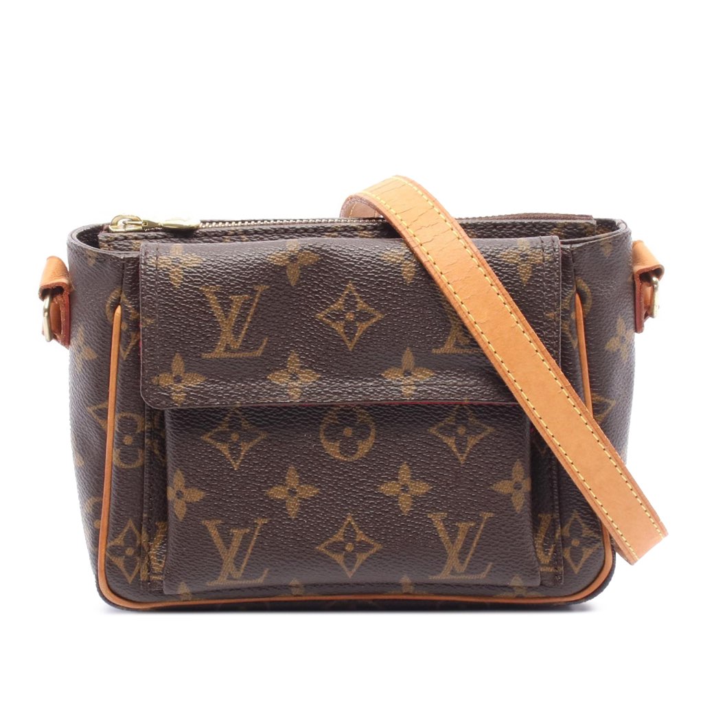 The Viva Cite PM features a monogram canvas body with vachetta leather trim, an adjustable flat vachetta shoulder strap, an exterior flap pocket, and a top zip closure.