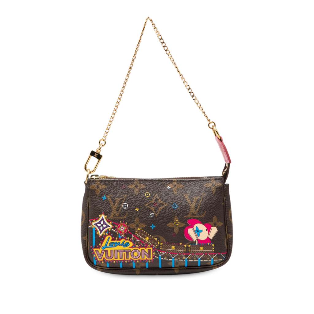 The Mini Pochette Accessoires features a monogram canvas body, a gold-tone chain handle, and a top zip closure.