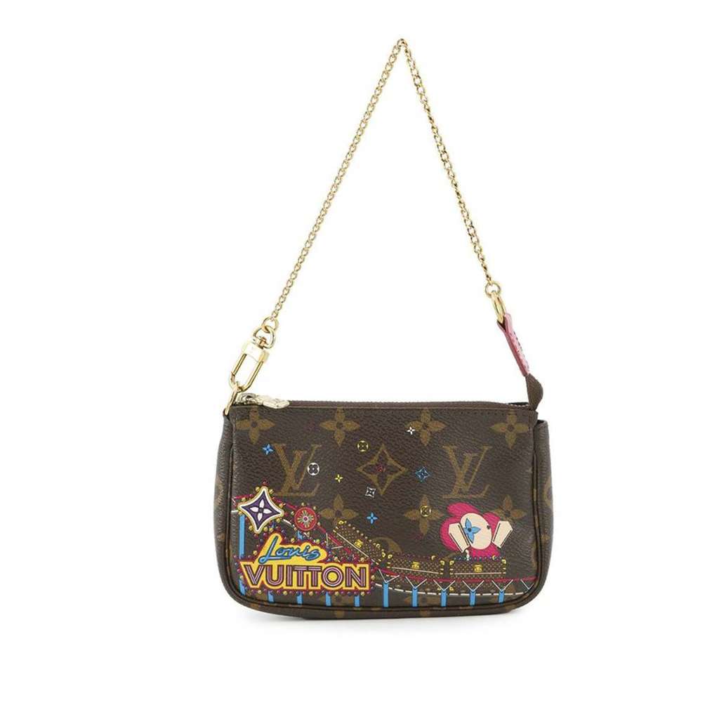 The Mini Pochette Accessoires features a monogram canvas body, a gold-tone chain handle, and a top zip closure.