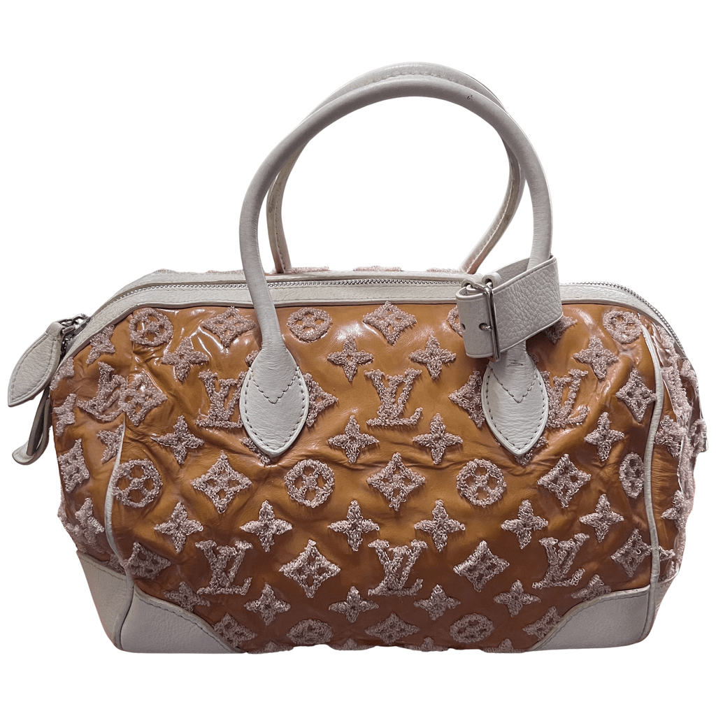 Louis Vuitton RoseMonogramBouclettes Speedy Round:Description•Made from patent lambskin in a pastel rose shade, with the Monogram Bouclettes texture (matte monogram embroidery over the patent leather). •White calf-leather handles and trim. •Silvertone hardware, includes a padlock + keys clochette. •Wide zip-top opening, roomy interior. •Limited edition (older / discontinued) — from around Spring/Summer 2012. Size / Measurements :•Length: ~ 27.3 cm (10.75 in) •Width / Depth: ~ 20.3 cm (8 in) •Height: ~ 21.6 cm (8.5 in) •Handle drop: ~ 8.3 cm (3.25 in)