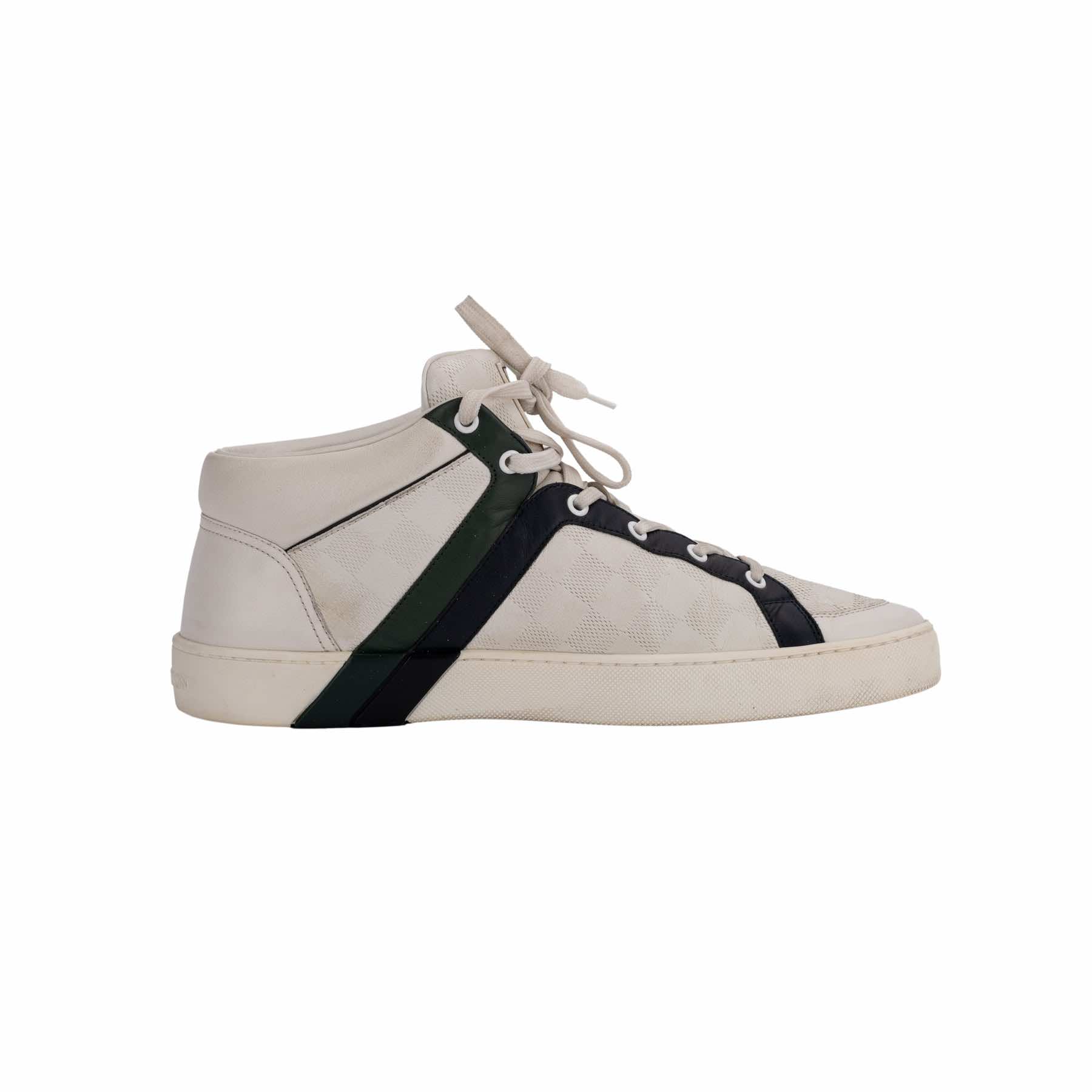 Louis Vuitton white calfskin sneakers with a subtle chess design with black and dark green stripe on the white canvas and the brand emblem on the tongue. This pair is crafted of white damier check leather and smooth whited calfskin leather trim