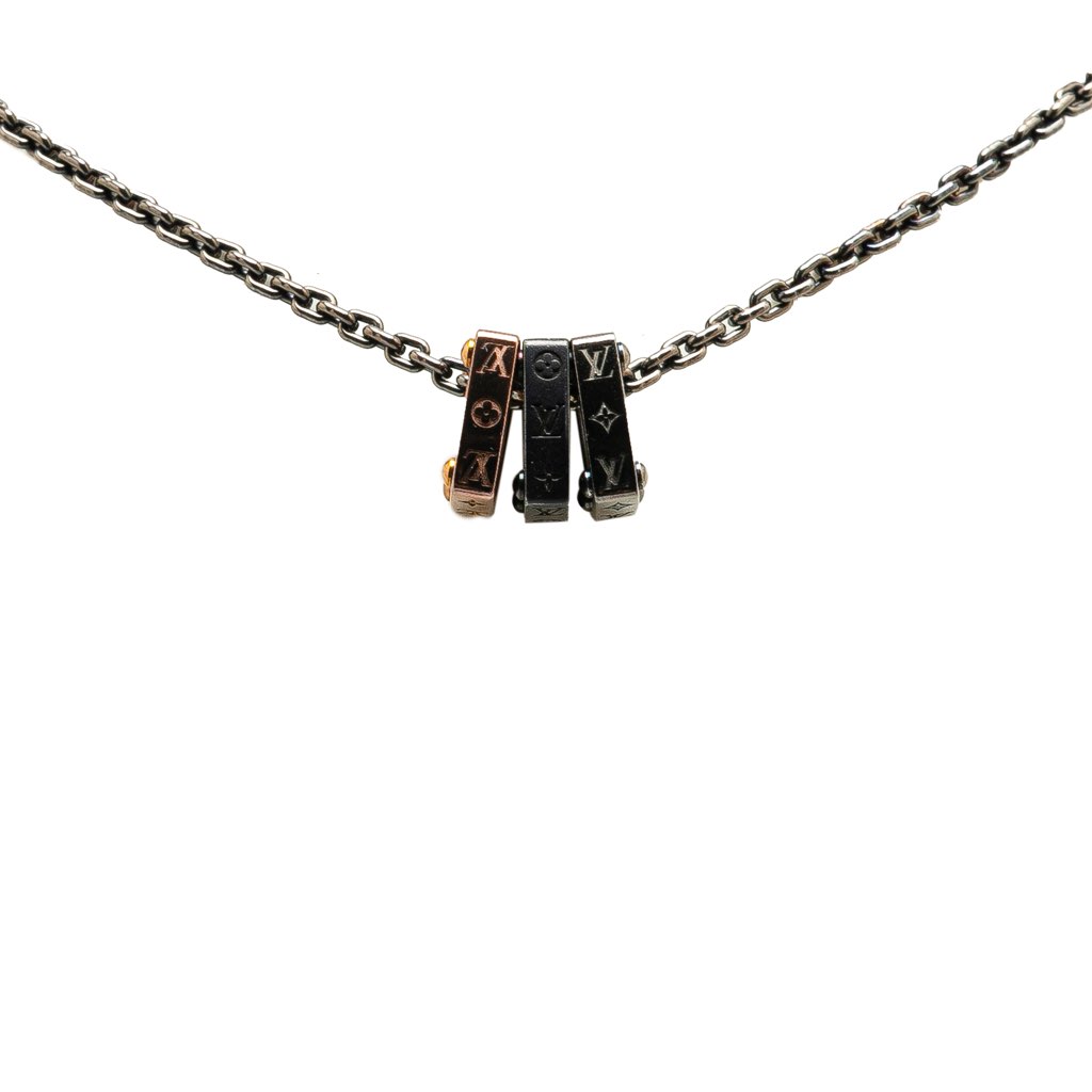 This necklace features a stainless steel chain, a gold-tone and silver tone pendants, and a lobster claw clasp closure.