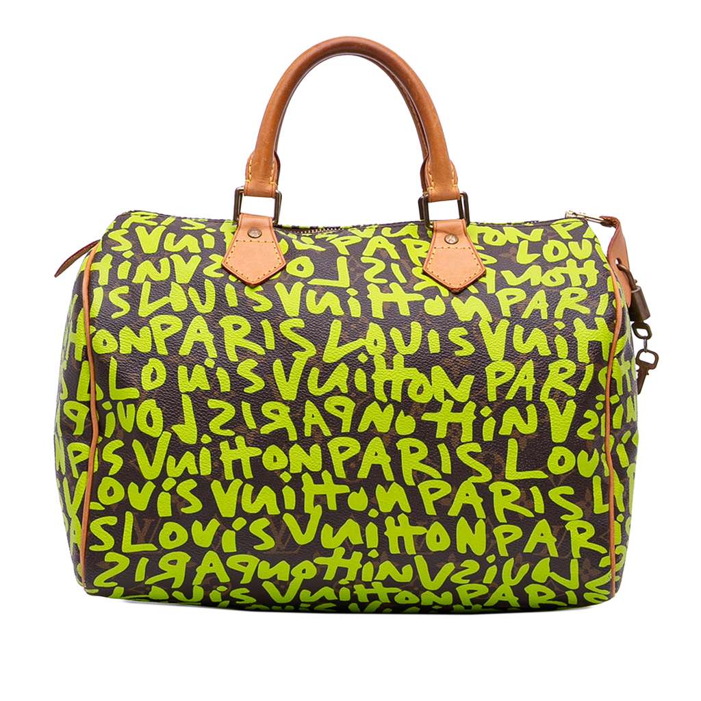 The Graffiti Speedy 30 features a printed monogram canvas body with vachetta leather trim, rolled vachetta leather handles, a top zip closure, and an interior pocket.
