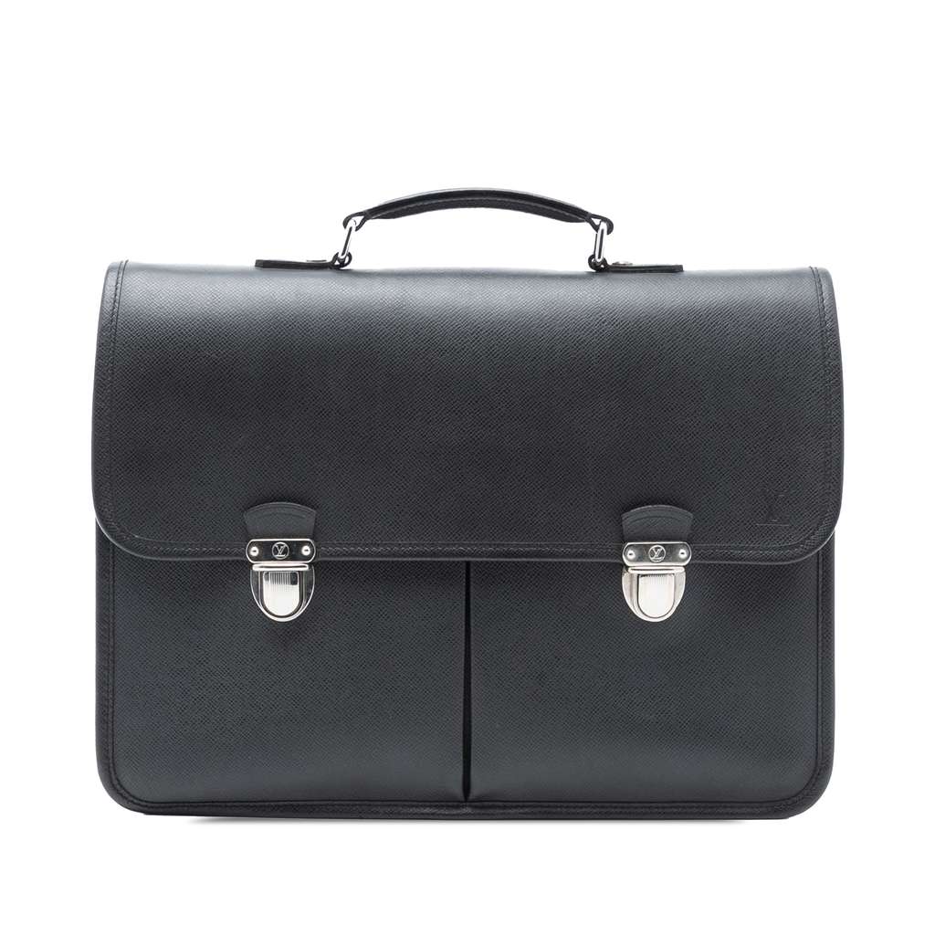 The Anton business bag features a taiga leather body, flat leather top handle, front flap with push lock closures, front slip pockets, and interior zip and slip pockets.
