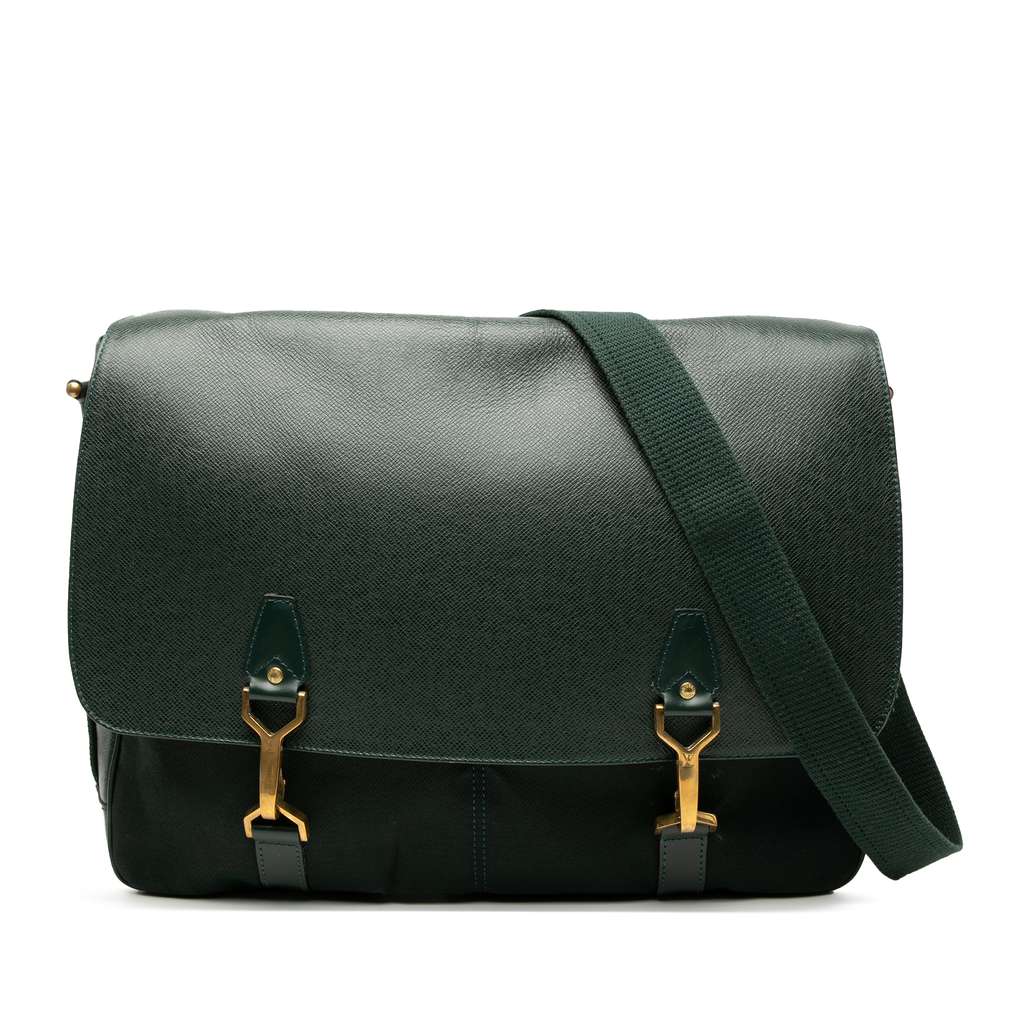 The Dersou features a taiga leather body, an adjustable flat canvas strap, a front flap with push lock closure, an exterior back zip pocket, and an interior zip pocket.