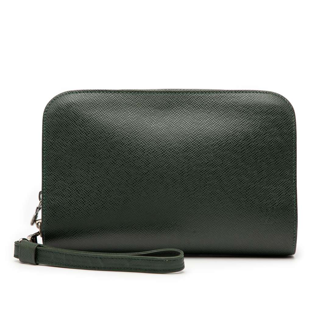 The Baikal features a taiga leather body, a flat leather wristlet, a top zip closure, an exterior slip pocket, and an interior slip pocket.