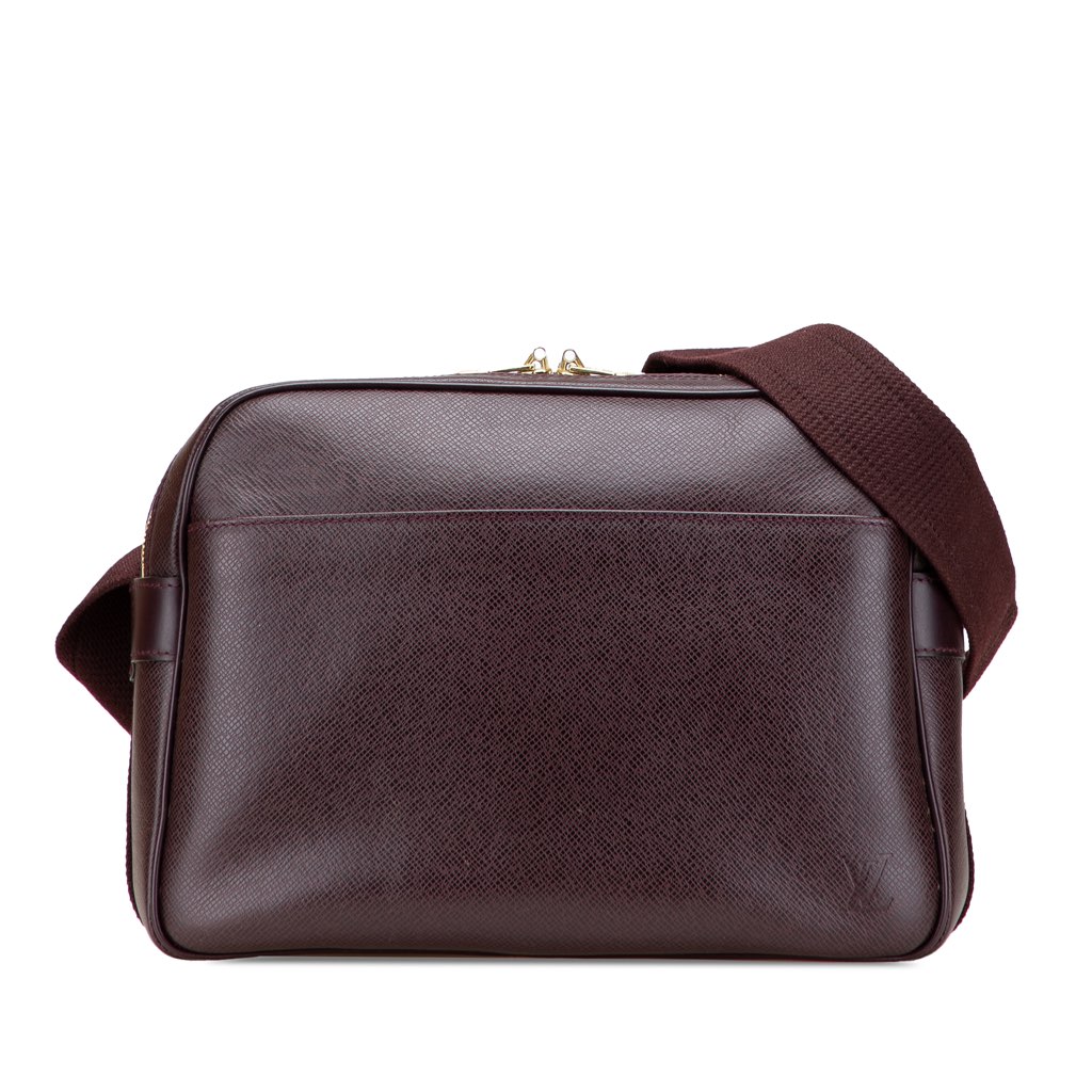 The Reporter PM features a taiga leather body, an adjustable flat strap, double top zip closures, an exterior slip pocket, and an interior slip pocket.