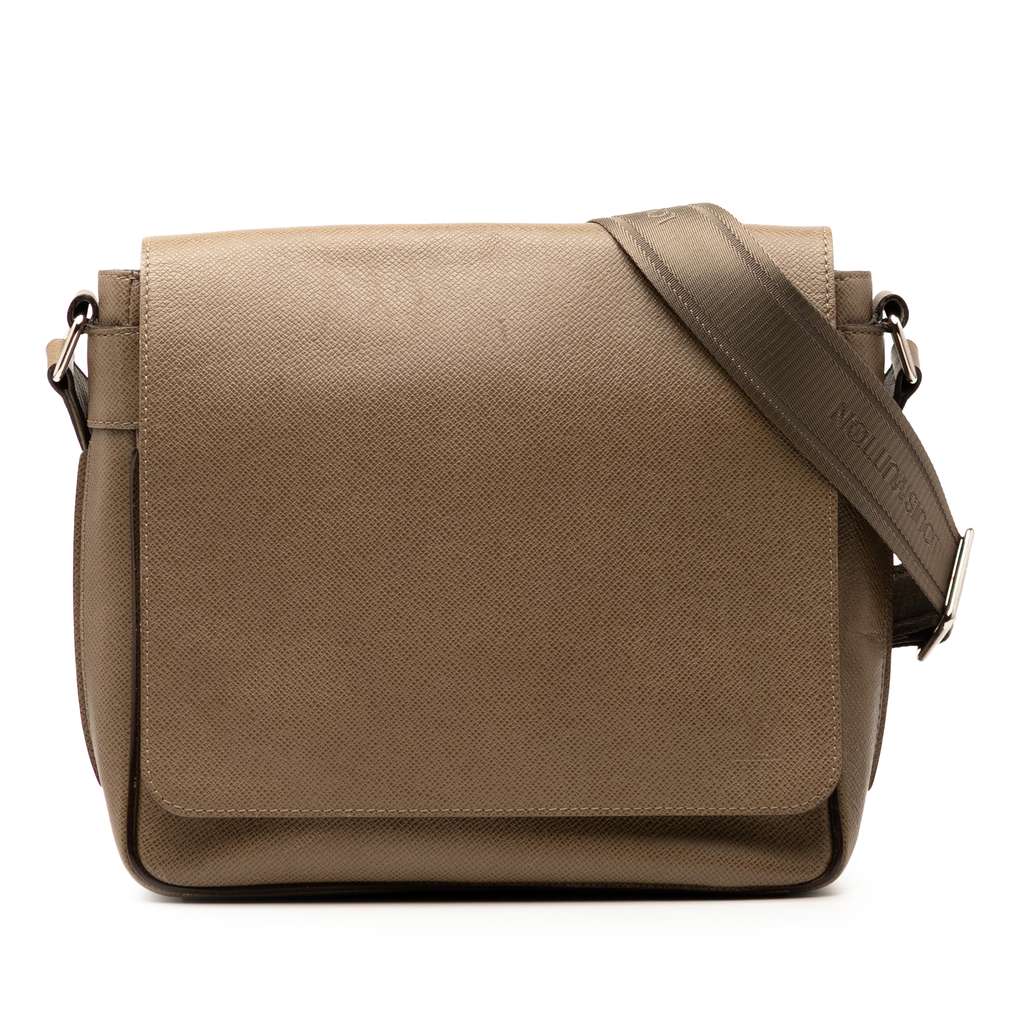 The Roman PM features a taiga leather body, an adjustable flat canvas strap, a front flap with magnetic snap button closure, and an interior zip pocket.
