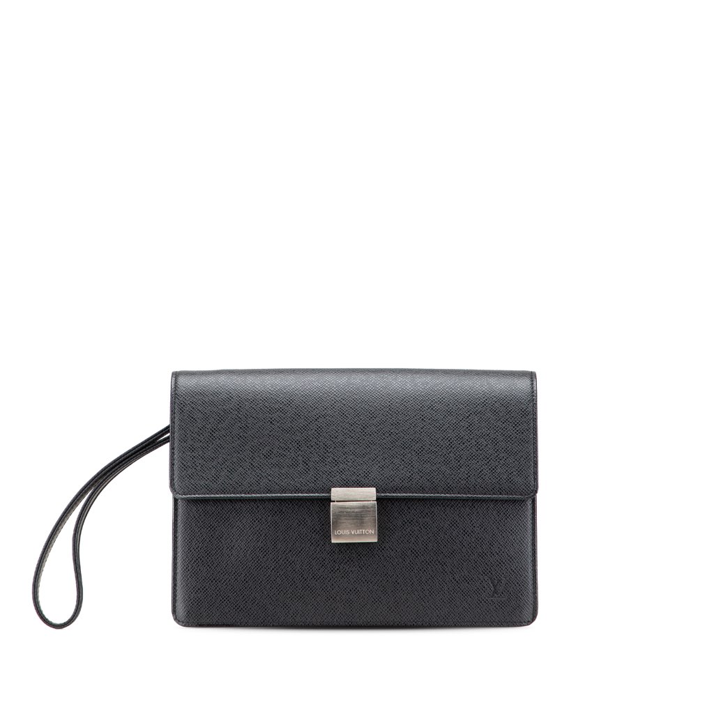 The Selenga features a taiga leather body, a flat leather wrist strap, a front flap with a push lock closure, an exterior back slip pocket, and interior zip and slip pockets.