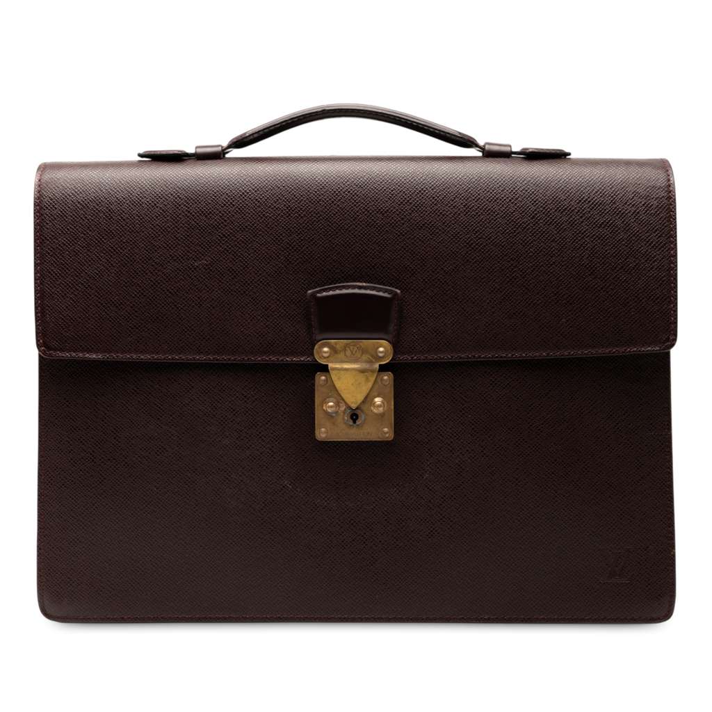 This briefcase features a taiga leather body, a flat leather top handle, a front flap with a push lock closure, and an exterior back slip pocket.