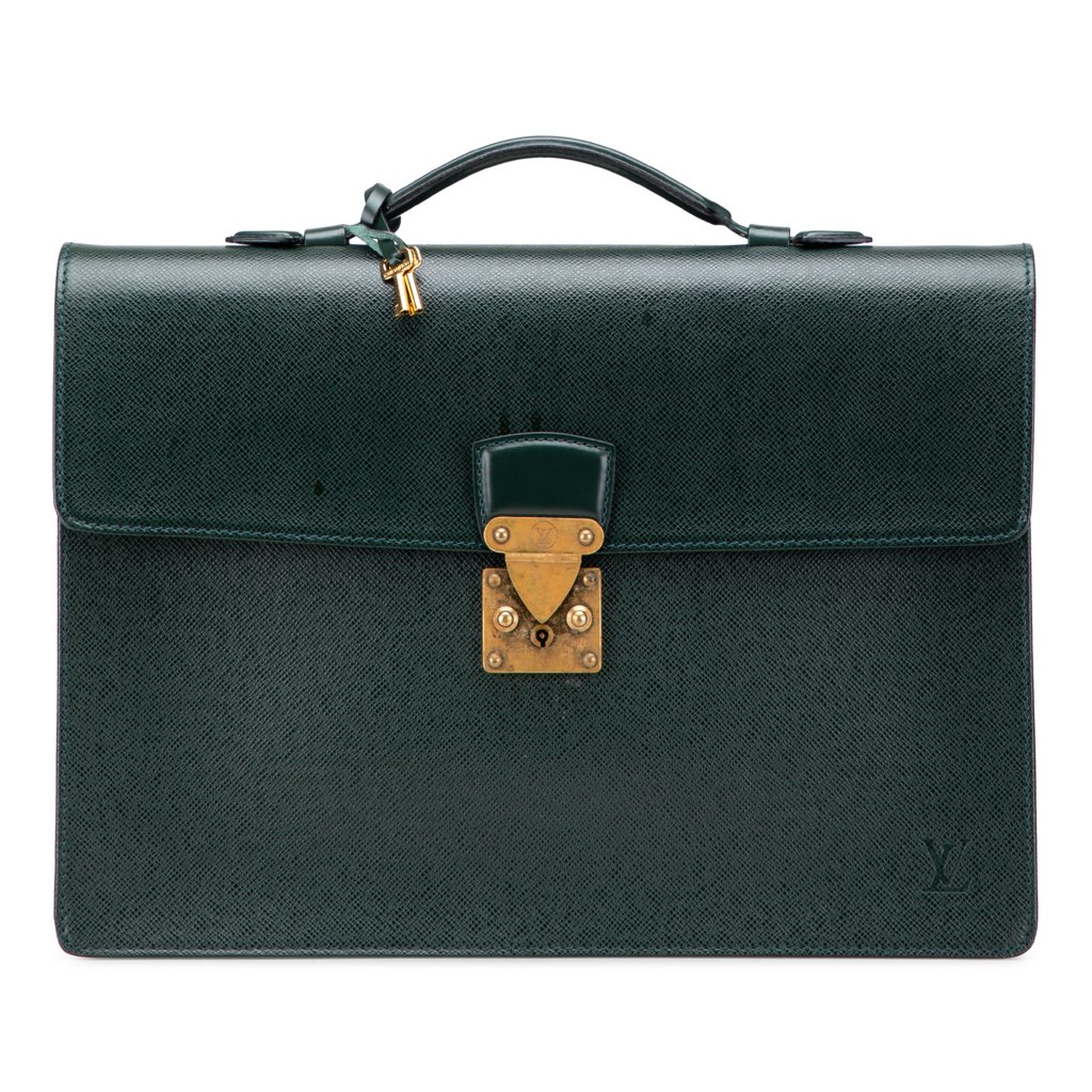This briefcase features a taiga leather body, a flat leather top handle, a front flap with a push lock closure, and an exterior back slip pocket.