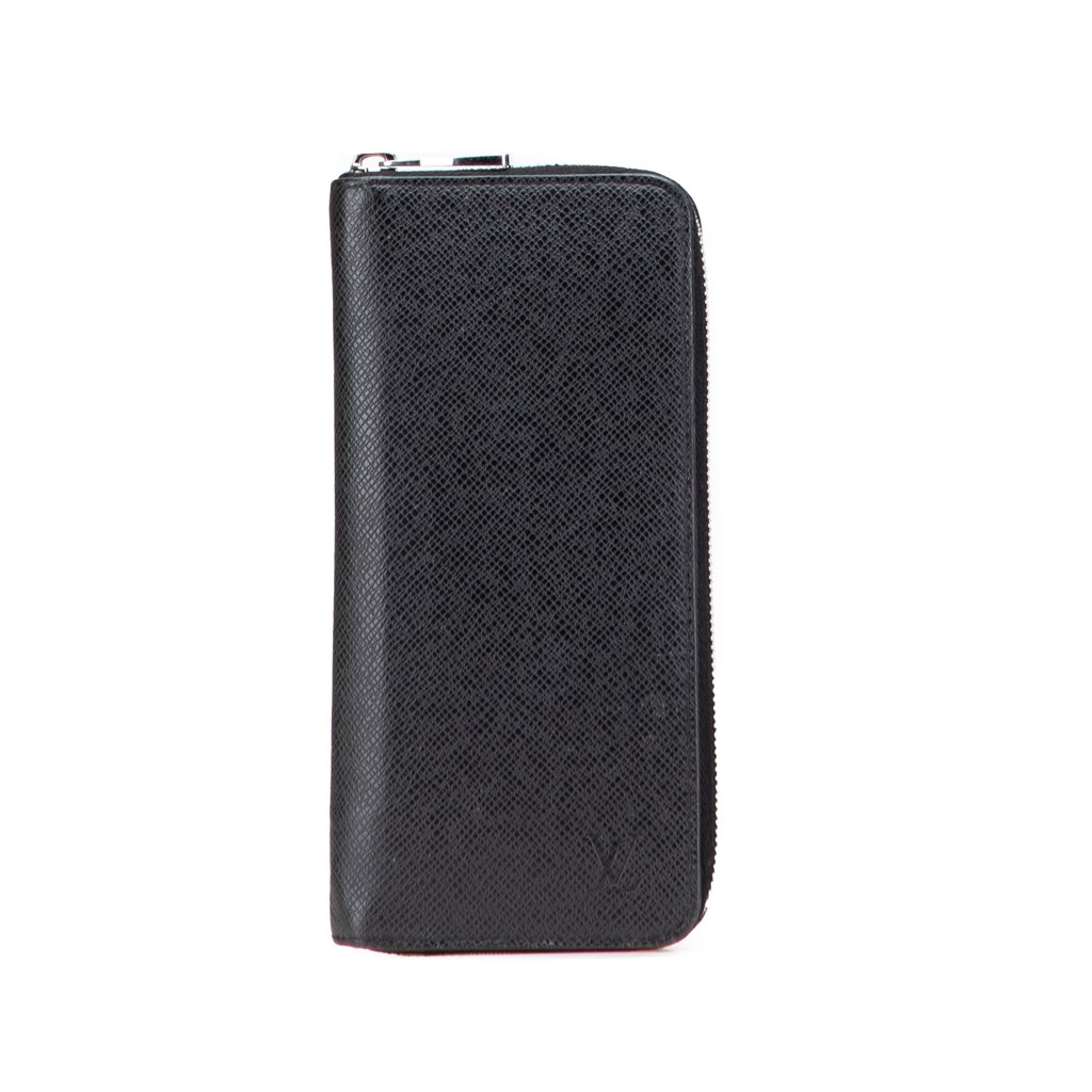 This long wallet features a taiga leather body, a zip around closure, and interior zip and slip compartments.