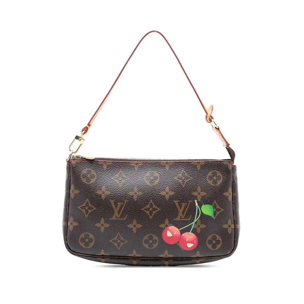 The Pochette Accessoires features a printed monogram canvas body, a removable flat vachetta strap, and a top zip closure.