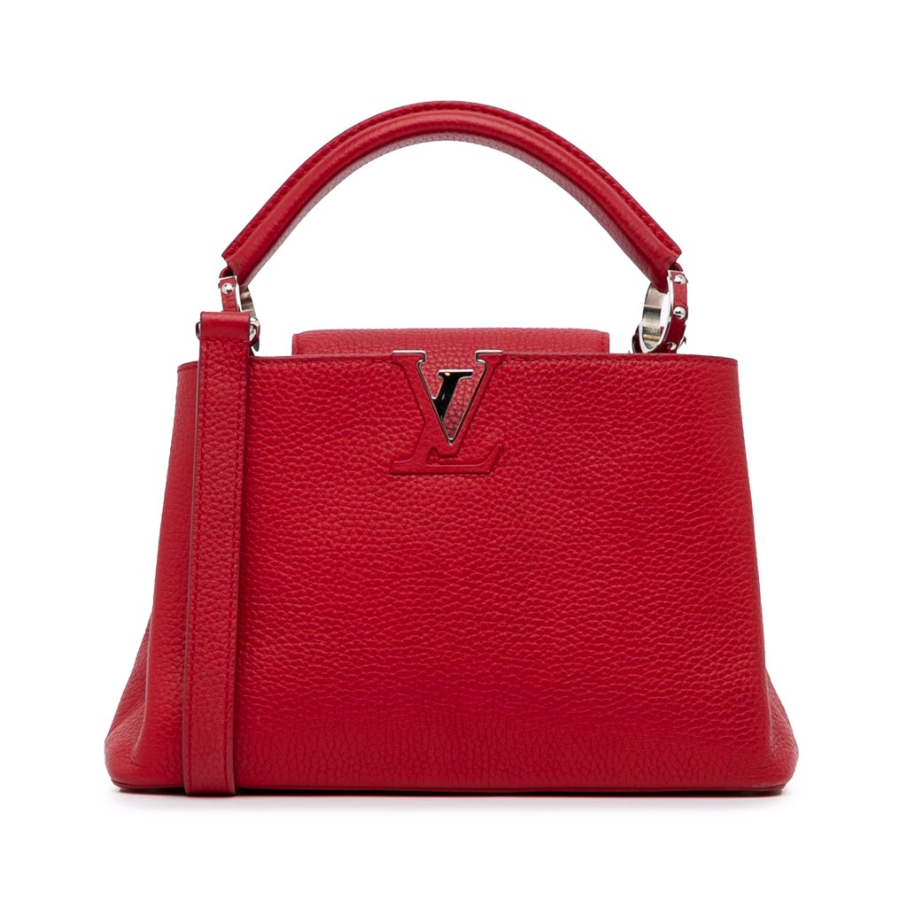 The Capucines BB features a leather body, a rolled leather top handle, a detachable strap, a top flap closure, and interior zip and slip pockets.