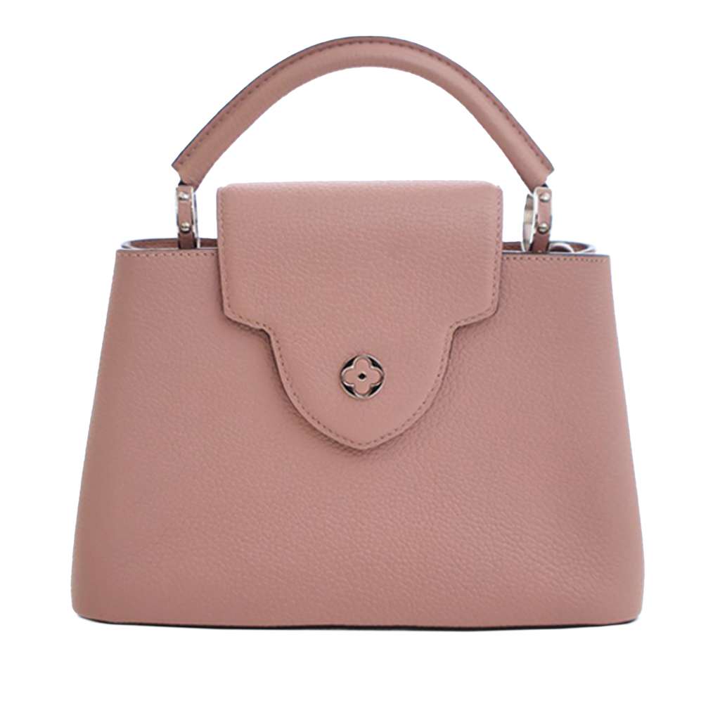 The Capucines BB features a taurillon leather body, a rolled leather handle, a detachable flat leather strap, an open top with a front flap closure, and interior zip and slip pockets.