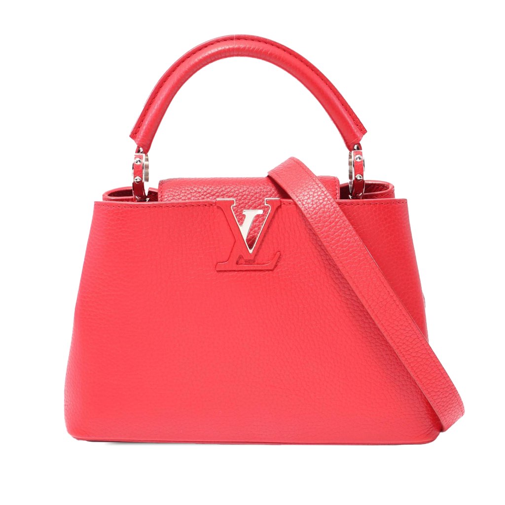 The Capucines BB features a leather body, a rolled leather top handle, a detachable strap, a top flap closure, and interior zip and slip pockets.
