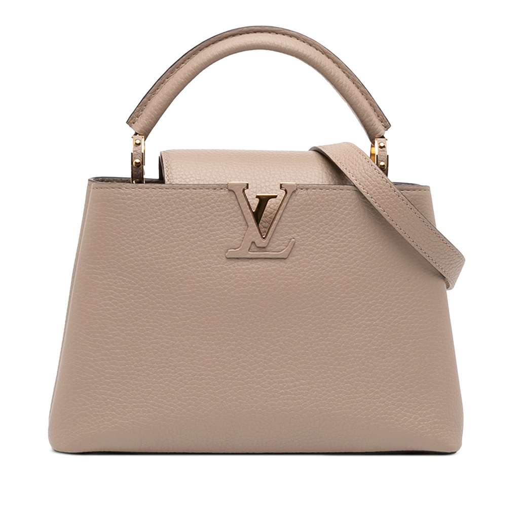 The Taurillon Capucines BB features a leather body, a rolled leather handle, a detachable flat leather strap, an open top with a front flap closure, and interior zip and slip pockets.