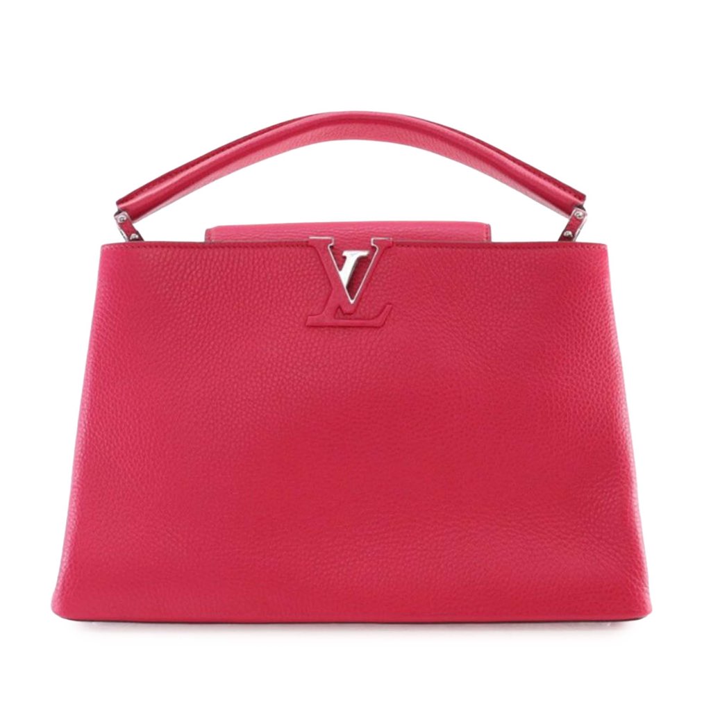 The Capucines MM features a Taurillon leather body, a leather top handle, an open top with a fold-in flap and a lobster clasp closure, and interior zip and slip pockets.