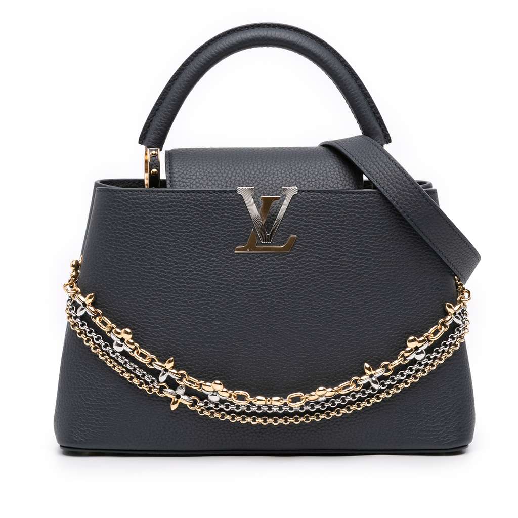 The Capucines MM features a taurillon leather body with gold- and silver-toned hardware, a rolled leather top handle, a detachable flat leather strap, a fold-in flap closure, and interior zip and slip pockets.