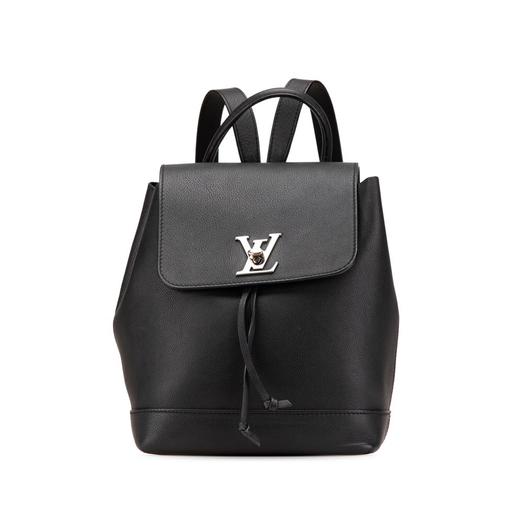 The Lockme backpack features a leather body, a flat leather top handle, flat leather back straps, a top flap with a silver-tone turn lock closure, a drawstring closure, and an interior slip pocket.