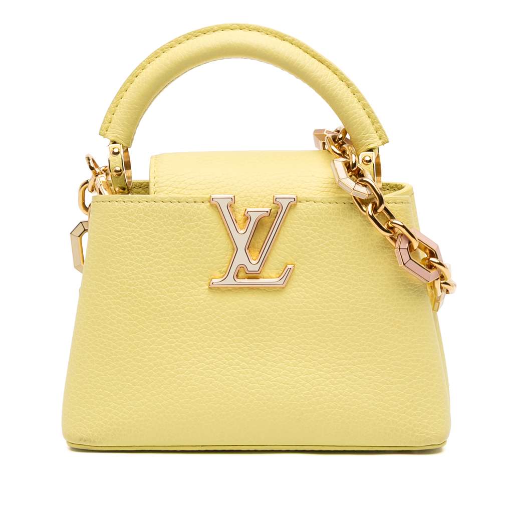 The Capucines Mini features a Taurillon leather body, a rolled leather top handle, an enamel chain link strap, a fold-in flap closure, a fold-in flap closure, and an interior slip pocket.