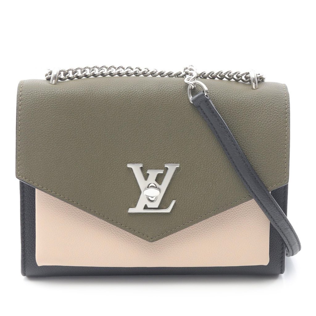 The MyLockMe BB features a leather body, a chain link strap with leather shoulder guard, a front flap with twist lock closure, an exterior front pocket under the flap, an exterior back zip pocket, and an interior slip pocket.