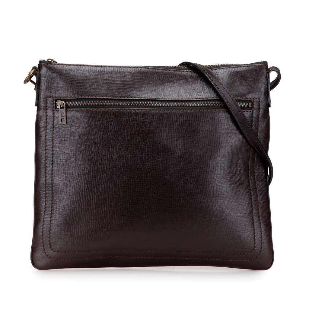 The Utah Sac Plat features a leather body, a flat leather strap, a top zip closure, exterior front and back zip pocket, and an interior pocket.