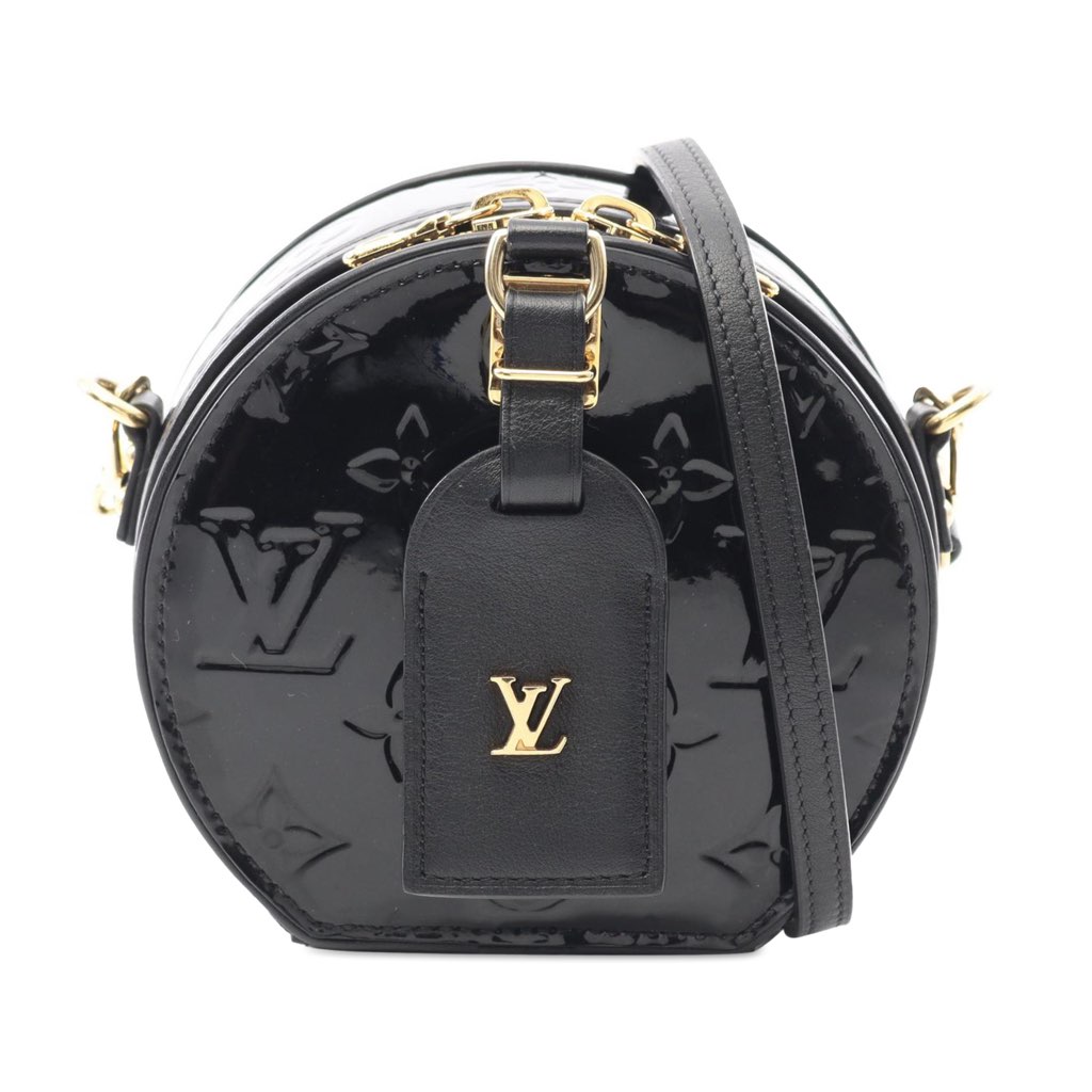 The Boite Chapeau Souple features vernis leather, a top zip closure, an adjustable flat leather strap, and an interior slip pocket.
