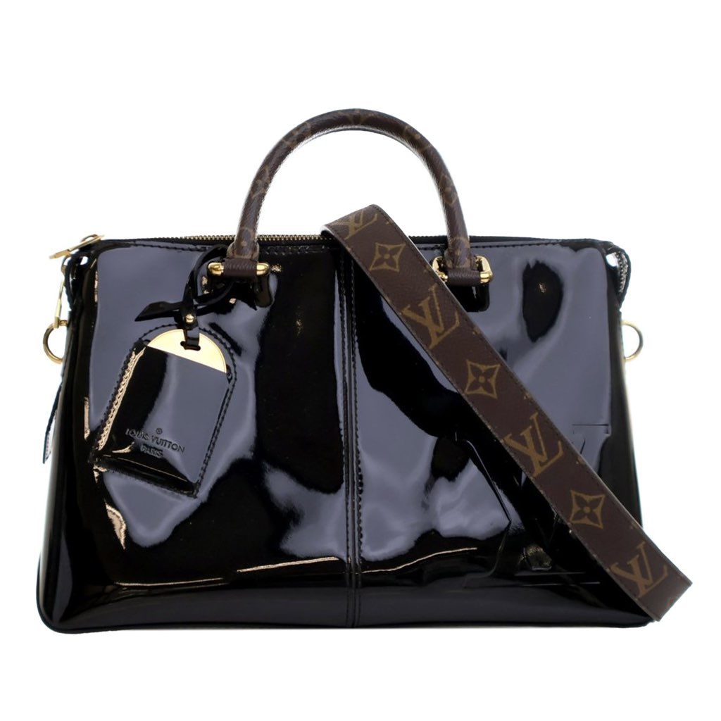 The Miroir Tote features a vernis leather body, rolled monogram canvas handles, a detachable flat strap, a top zip closure, and interior slip pockets.