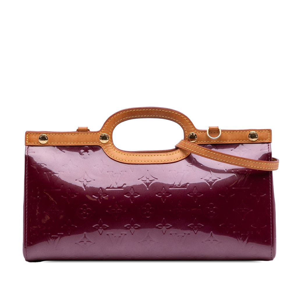 The Roxbury Drive features a vernis leather body, a leather top and an detachable shoulder strap, an open top, and an interior slip pocket.