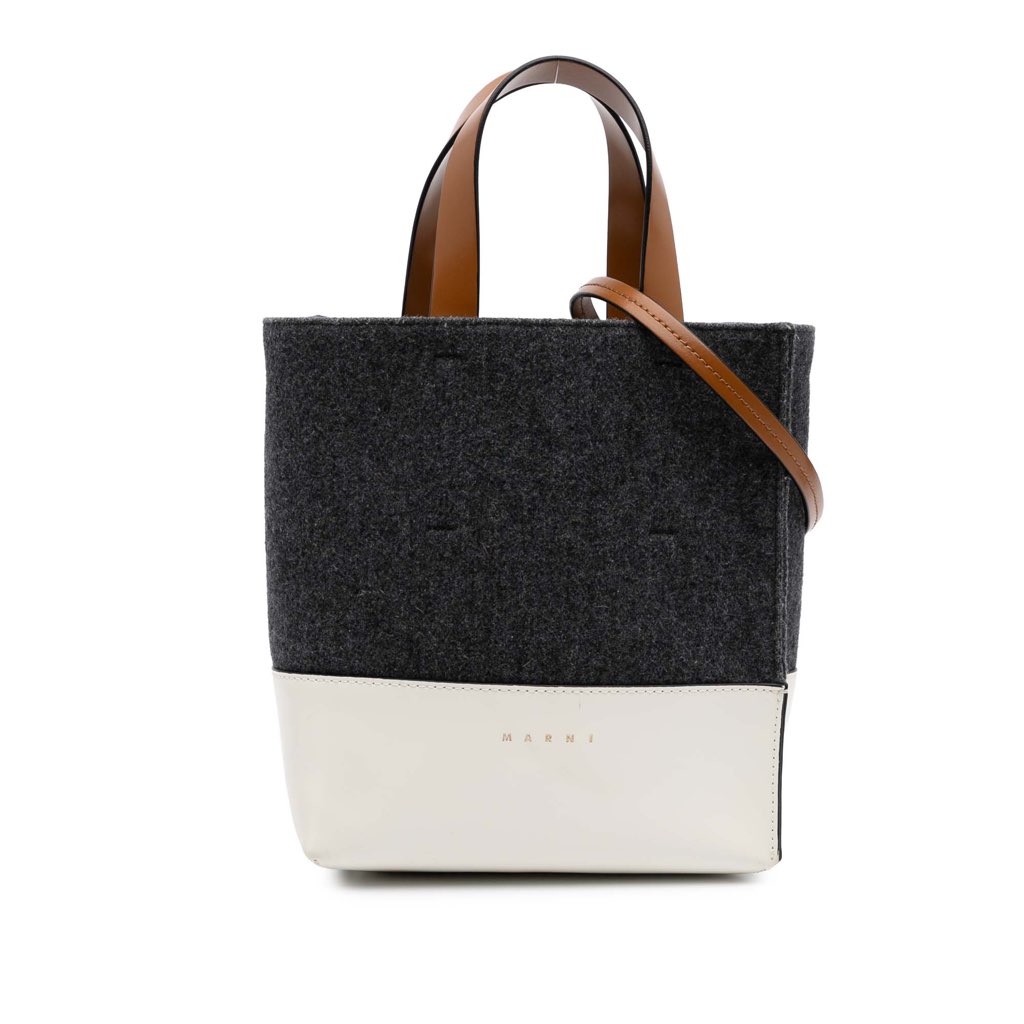 The Museo tote features a wool and leather body, flat leather handles, a detachable flat leather strap, an open top, and an interior slip pocket.