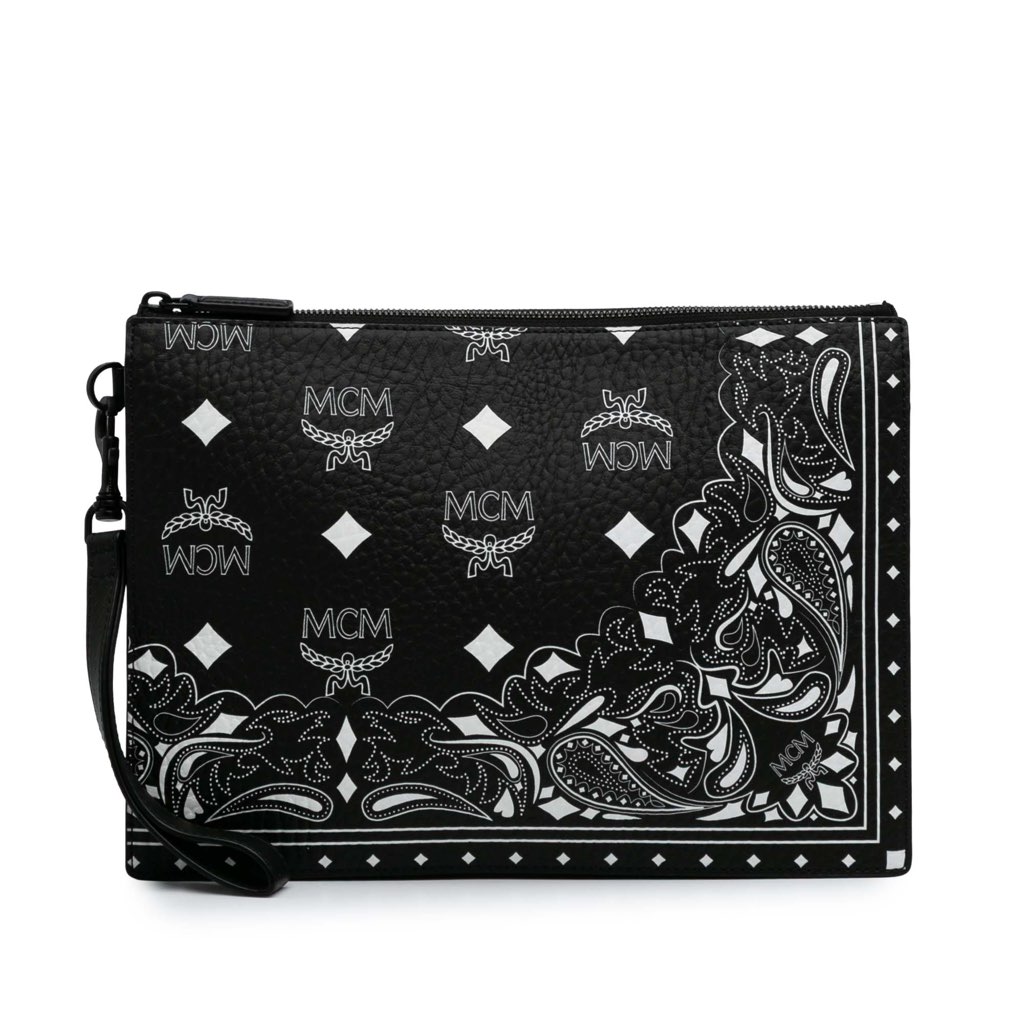 This clutch features a printed coated canvas body, a detachable flat leather wrist strap, a top zip closure, and an interior zip pocket.