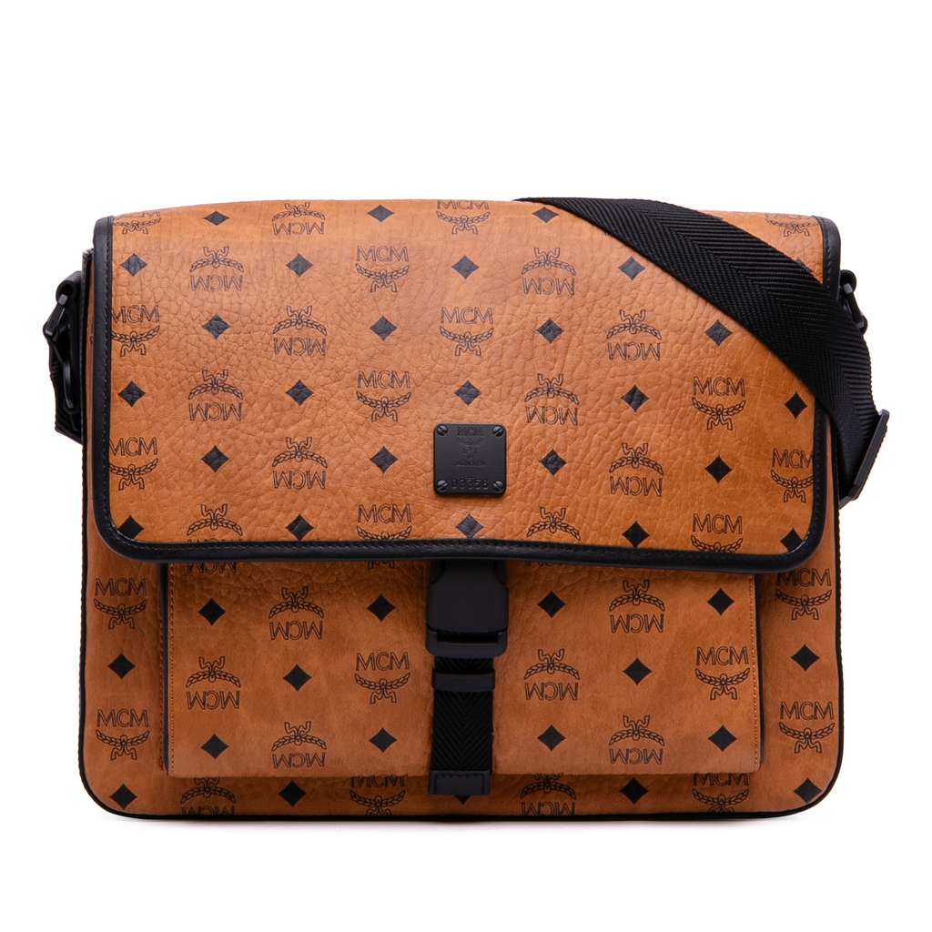 This crossbody bag features a coated canvas body with leather trim, an adjustable flat strap, a front strap with buckle closure, a n exterior front flap with buckle closure, and an interior zip pocket.