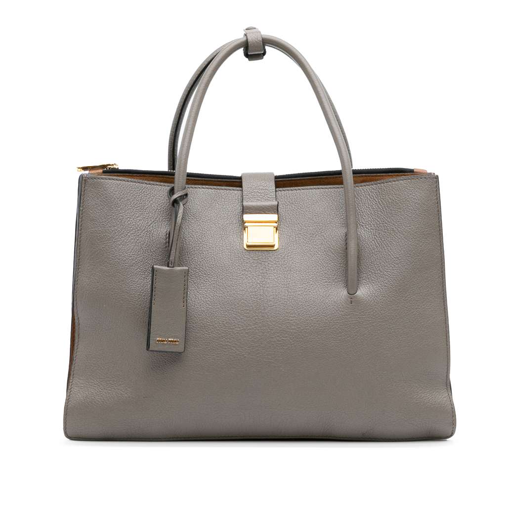 This satchel features a goatskin leather body, rolled leather handles, an open top with a flap tab and push lock closure, an exterior zip pocket, an interior center zip compartment, and interior zip and slip pockets.