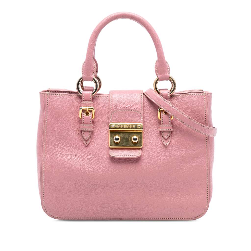 This satchel features a goatskin body, rolled handles, a detachable flat strap, a top strap with S-lock closure, and interior zip and slip pockets.