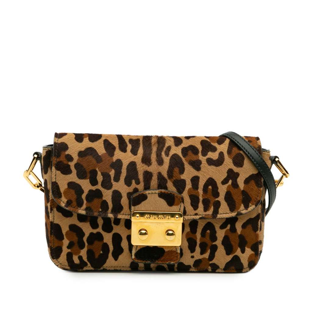 This crossbody bag features a leopard print calfskin hair body, a chain link strap with leather guard, a front flap with magnetic snap closure, and interior zip and slip pockets.