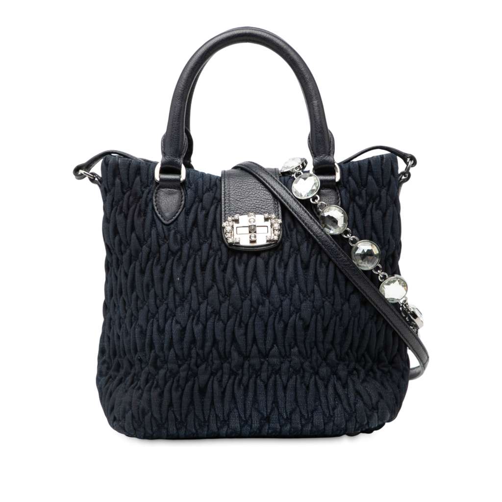 This satchel features a gathered denim body, rolled leather handles, crystal-embellished chain strap, a detachable flat leather shoulder strap, a top strap with turn-lock closure, and interior slip pockets.