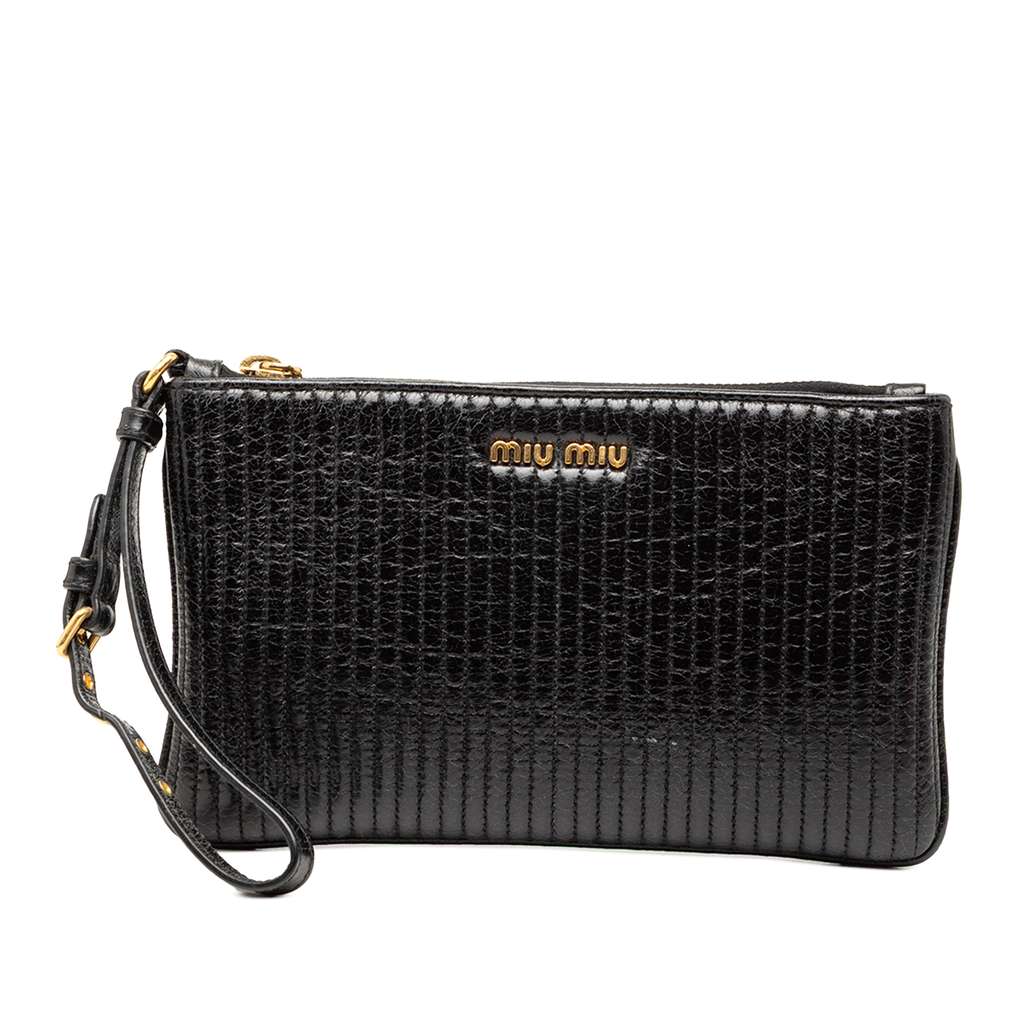 This clutch bag features a quilted lambskin leather body, an adjustable flat wrist strap, a top zip closure, and an interior slip pocket.