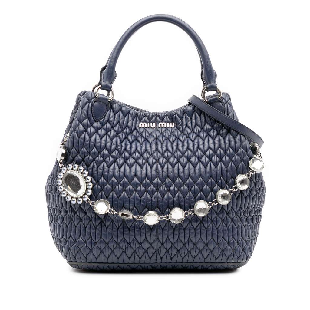 This satchel features a quilted nappa leather body, rolled leather handles, a detachable flat leather strap, an open top with magnetic closure, and an interior zip pocket.
