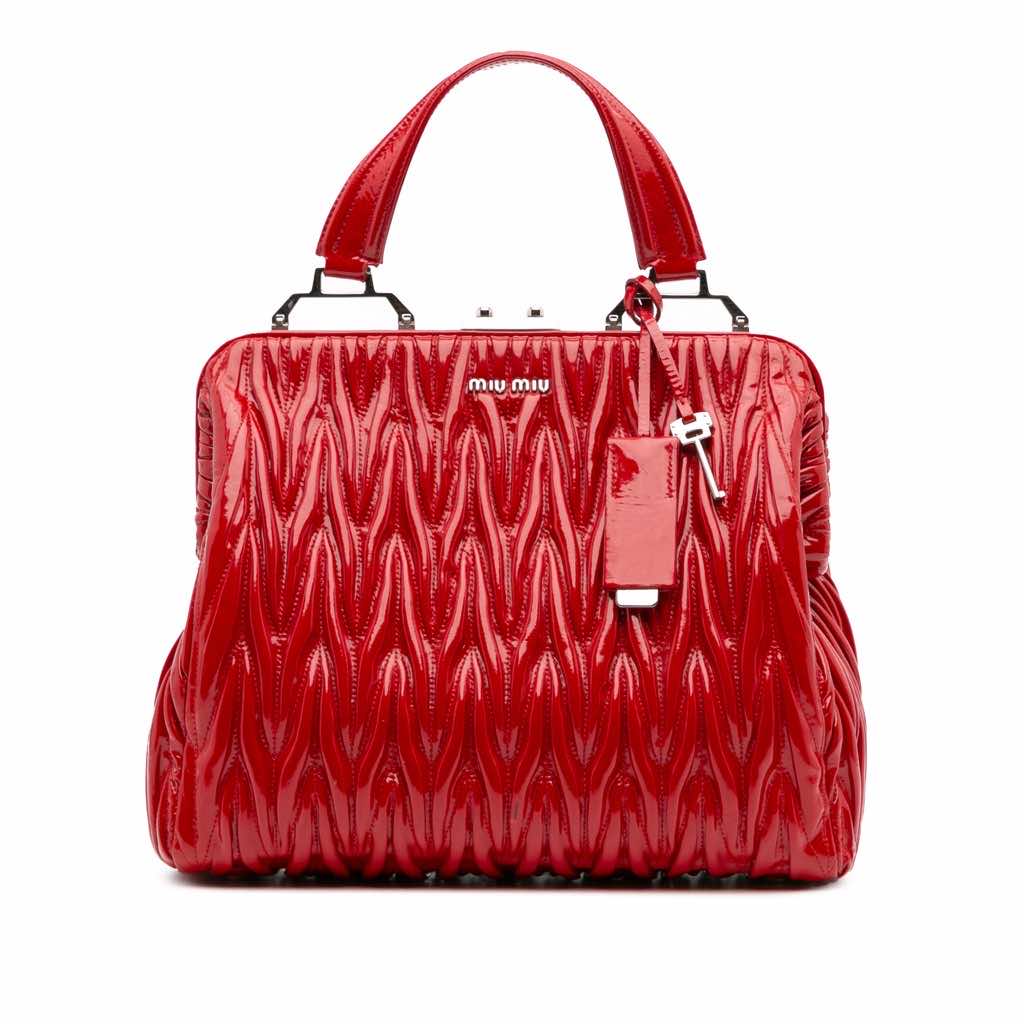 This handbag features a quilted patent leather body, flat leather handles, a top frame with push lock closure, and interior zip and slip pockets.