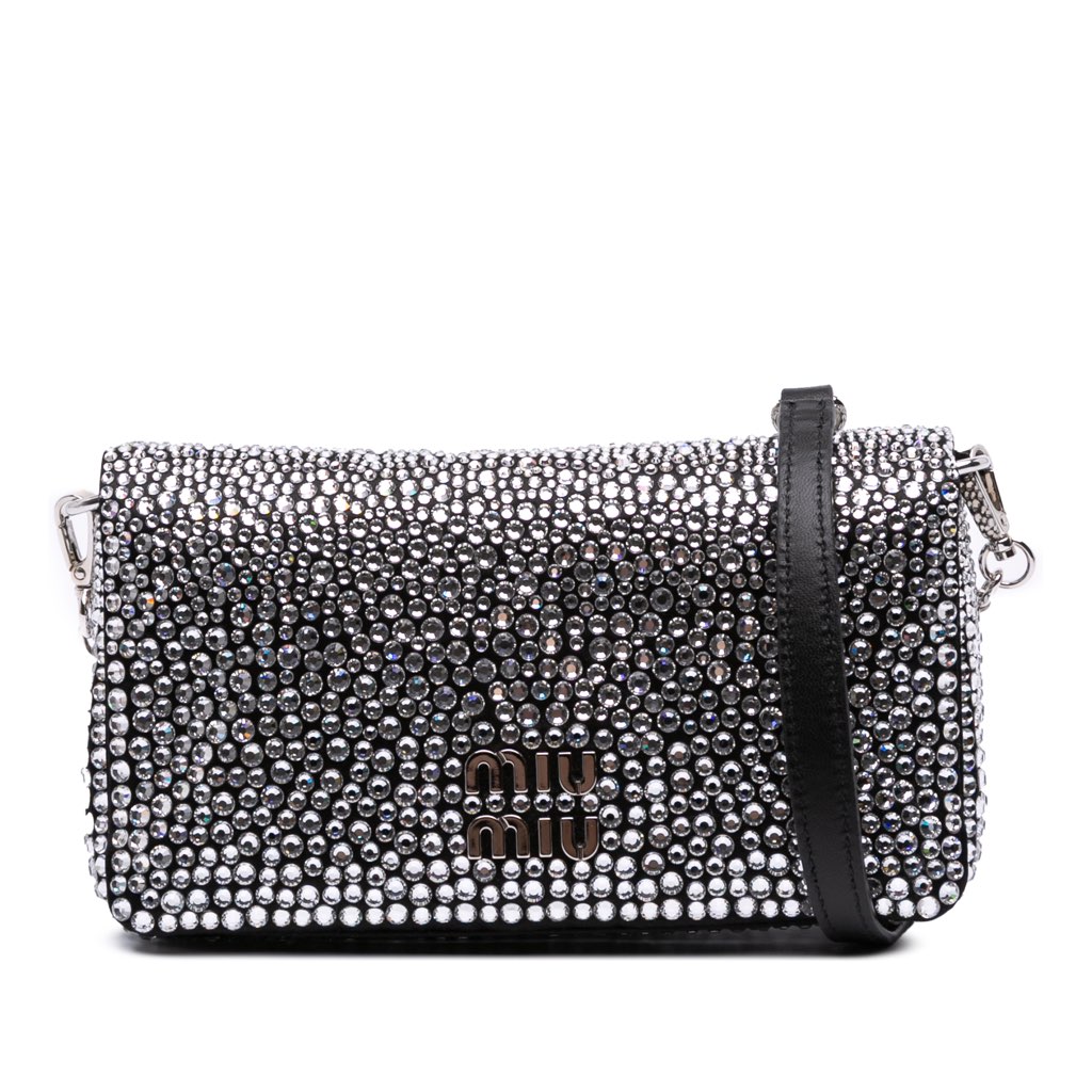 This crossbody features a crystal embellished satin body, a detachable chain link strap with leather shoulder guard, a front flap with magnetic closure, and an interior slip pocket.